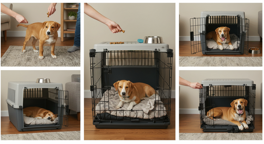- Use verbal cues like “crate time” to establish clear associations.